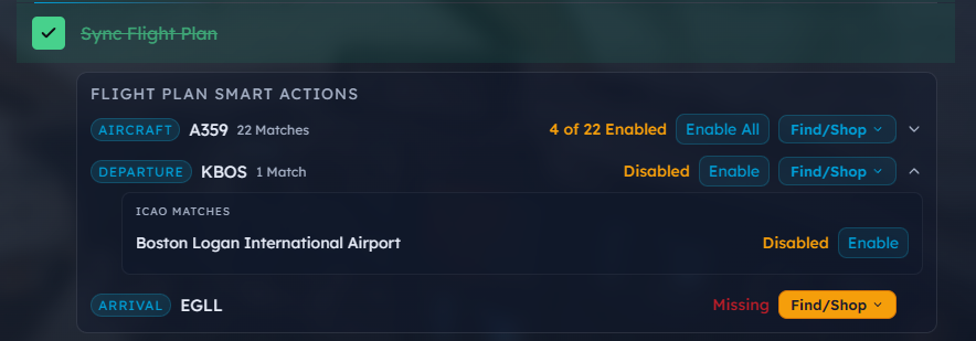 New Find/Shop buttons (FS Addon Compare, Flightsim.to, iniBuilds, Contrail) for matching aircraft and airports