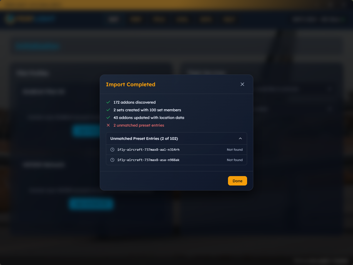 Scan for addons - After import, click "Close & Start Scan" to let PERFLIGHT discover all the addons in your newly imported libraries. Once scanning completes, your presets will be automatically converted to Sets and location data will be applied to matching addons.